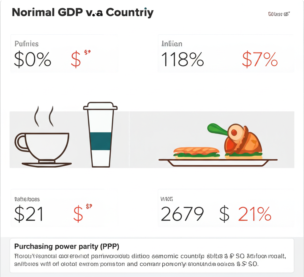 在國際經濟對比中,僅靠名目 GDP 會有明顯問題。名目 GDP 用當前市場匯率轉成單一貨幣(多半是美元),這容易誇大物價高的富裕國家的規模,同時低估物價低的開發中國家。例如,在美國拿 5 萬美元能買到的東西,可能和在印度拿 2 萬美元買的量差不多,儘管數字上看起來天差地遠。